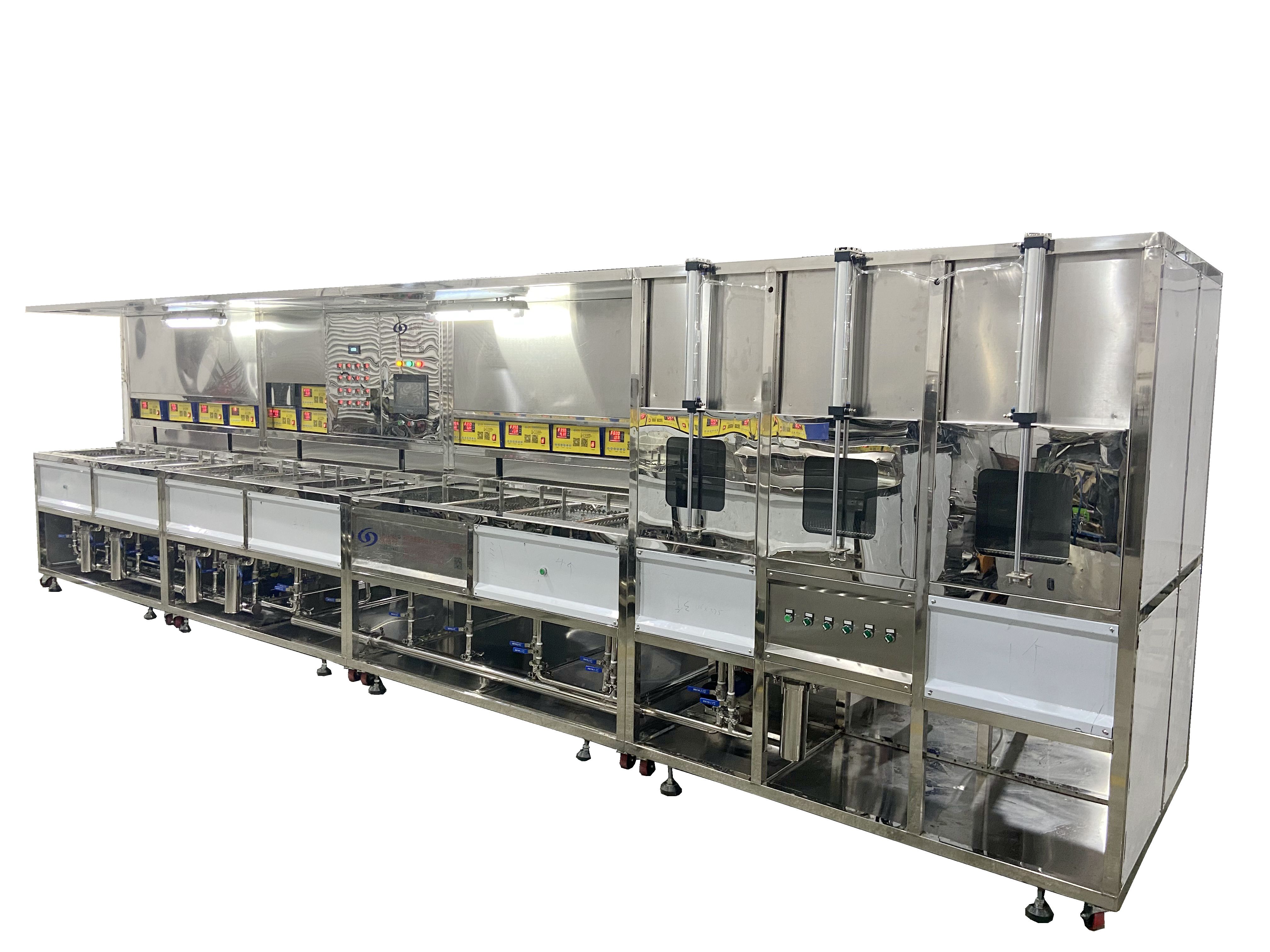 威固特VGT-1509FH為前處理光學超聲波清洗機,設備共有15個功能槽,配置有拋動系統、循環過濾系統、自動恒溫系統、超聲波清洗系統、定時系統、框架系統、CO2滅火系統等。設備采用環保型水溶劑洗滌、純水漂洗,為環保型清洗系統。配電箱用全不銹鋼結構。